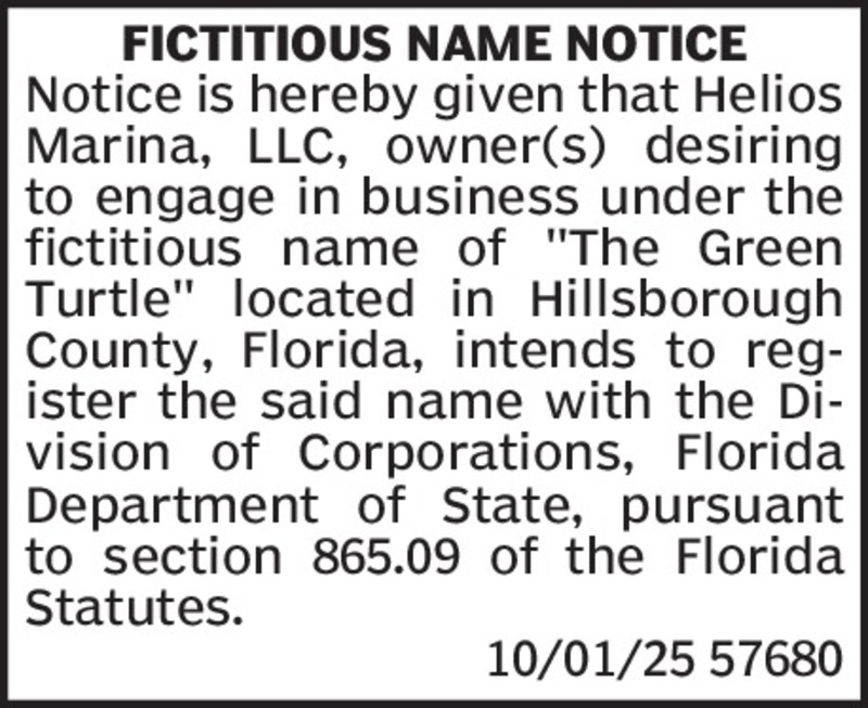 Fictitious Name NoticeNotice is hereby given that Katy & George Reitsma, desiring to engage in business under the fictitious name of Play It Again Sports located at 2672 Lakebreeze Ln S, Clearwater...