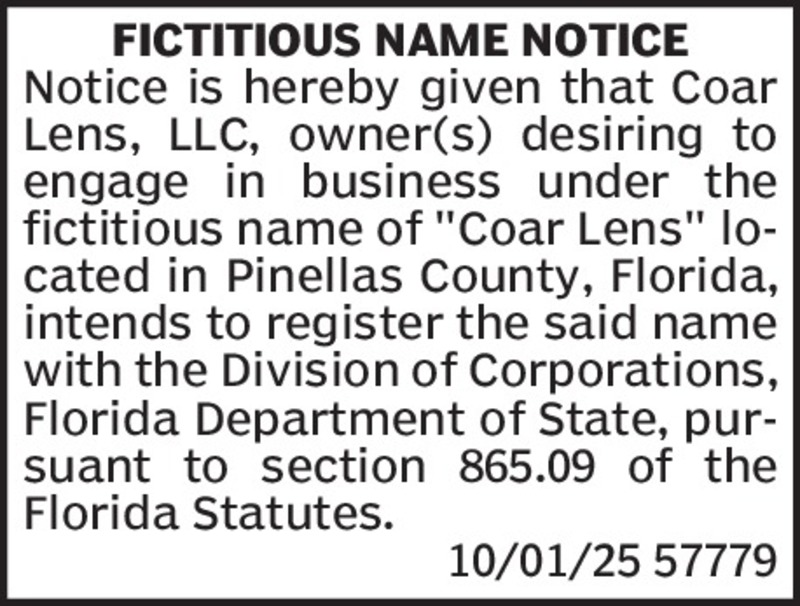 Fictitious Name NoticeNotice is hereby given that Katy & George Reitsma, desiring to engage in business under the fictitious name of Play It Again Sports located at 2672 Lakebreeze Ln S, Clearwater... Show more »