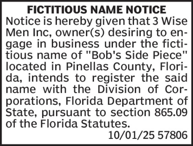 Fictitious Name NoticeNotice is hereby given that Katy & George Reitsma, desiring to engage in business under the fictitious name of Play It Again Sports located at 2672 Lakebreeze Ln S, Clearwater... Show more »
