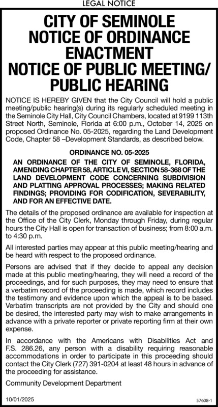 NOTICE OF PUBLIC SALE SEVEN SPRINGS SELF STORAGE, 2852 SEVEN SPRINGS BLVD., NEW PORT RICHEY, FL 34655, 727-376-7867 HEREBY GIVES NOTICE OF SALE ON WEDNESDAY October 8, 2025 10AM TO SATISFY A LANDL...