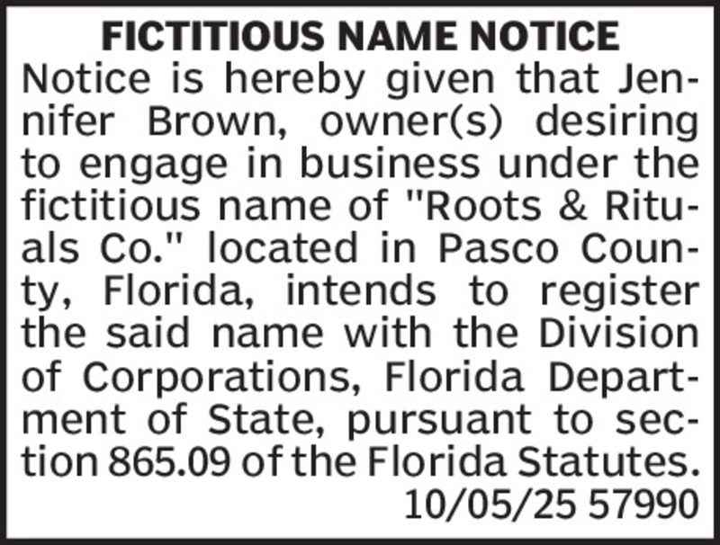 Fictitious Name NoticeNotice is hereby given that Kenna C. Main, desiring to engage in business under the fictitious name of Kenna Main Designs located at 7134 Captiva Circle, New Port Richey, FL 3...