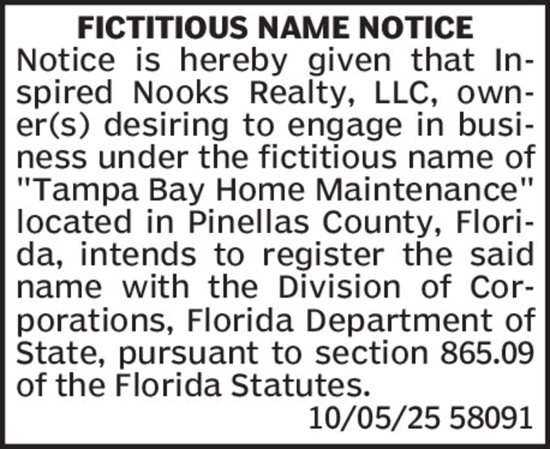 Fictitious Name NoticeNotice is hereby given that Kenna C. Main, desiring to engage in business under the fictitious name of Kenna Main Designs located at 7134 Captiva Circle, New Port Richey, FL 3...