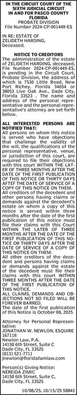 IN THE CIRCUIT COURT FOR HERNANDO COUNTY,FLORIDA PROBATE DIVISIONFile No. 2025-CP-1096Division IN RE: ESTATE OF JOYCE C. HABER Deceased. NOTICE TO CREDITORSThe administra... Show more »