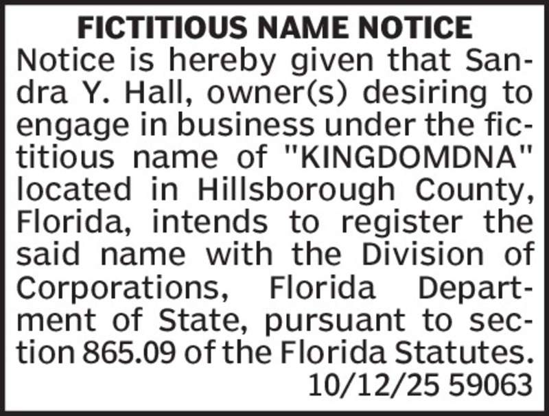 NOTICE UNDER FICTITIOUS NAME LAW PURSUANT TO SECTION 865.09, FLORIDA STATUTES NOTICE IS HEREBY GIVEN that the undersigned, desiring to engage in business under the Fictitious Name of Woodlawn Memor... Show more »