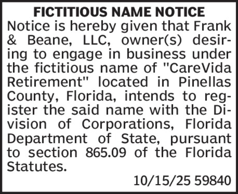 FICTITIOUS NAME NOTICENotice is hereby given that Innovative Mortgage Services, Inc. and Bryan P Ehrlich, CEOowner(s), desiring to engage in business under the fictitious name of “Innovative Mortga...
