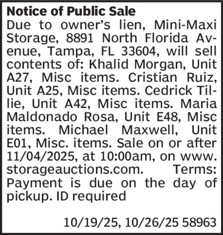 U-Haul Co of GainesvilleNotice is hereby given that on November 6th, 2025 U-Haul hereby publishes notice, as required by Florida “Self-Storage Act”, section 83.806 and 83.807, of a public sale of t... Show more »