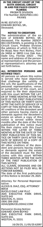IN THE CIRCUIT COURT FOR HILLSBOROUGH COUNTY, FLORIDAPROBATE DIVISIONFile No. 2025-CP-3584Division: AIN RE:  ESTATE OFMATTHEW DANIEL FRISCO,Deceased.NOTICE TO CREDITORSThe administration of the est... Show more »