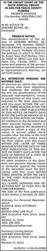 IN THE CIRCUIT COURT FOR 	PASCO COUNTY, FLORIDAPROBATE DIVISIONFile No. 25-CP-1121-WSDivision ____________IN RE: ESTATE OF             ERIC BULLOCK,               Deceased.NOTICE TO CREDITORS The a... Show more »
