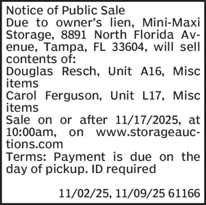 NOTICE OF AUCTIONSpacebox Storage will hold an auction on November 5th 2025 for the following units:Unit # 3024 Adam Champneys & Cordale Alexander #2132 and will be posted online at Bid13.The units...