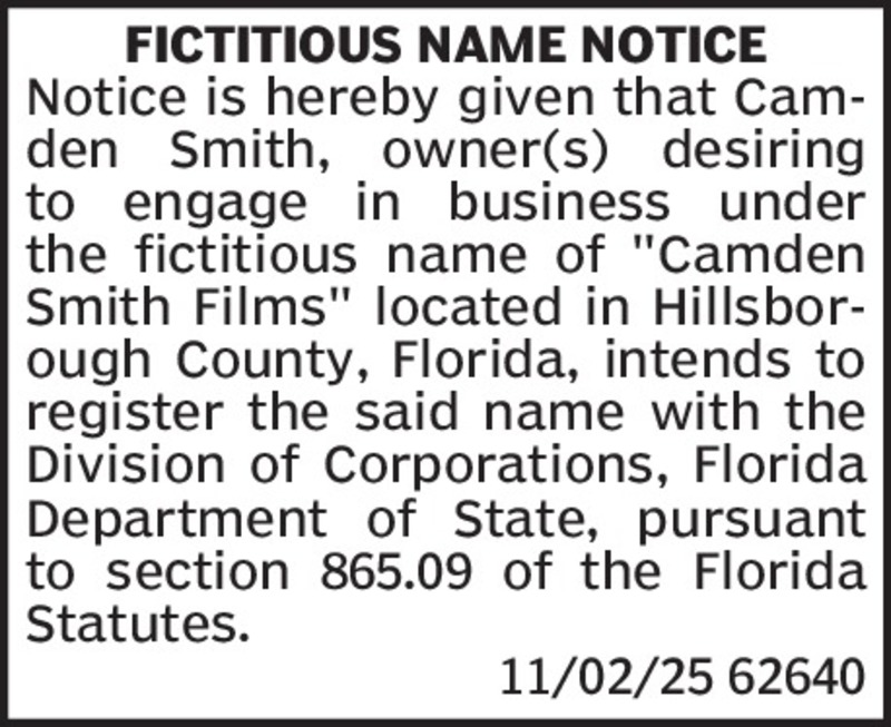 FICTITIOUS NAME NOTICENotice is hereby given that Decks & Docks Lumber Company, LLC, sole owner, desiring to engage in business under the fictitious name of “Deckstore.com” located in Pinellas Coun...