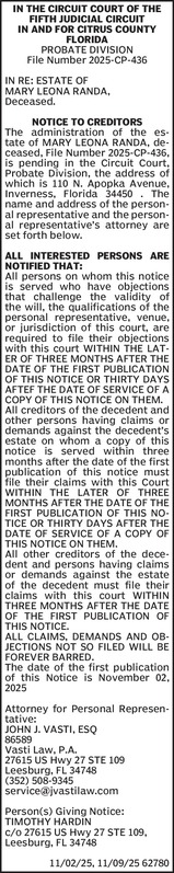 IN THE CIRCUIT COURT FOR CITRUS COUNTY, FLORIDA PROBATE DIVISIONFile No. 2025-CP-000976-ADivision IN RE: ESTATE OF EDUARDO M. VELEZ Deceased. NOTICE TO CREDITORSThe a... Show more »