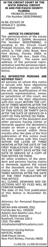 IN THE CIRCUIT COURT FOR CITRUS COUNTY, FLORIDAPROBATE DIVISIONFile No.: 2024-CP-988IN RE: ESTATE OFJAMES GORMAN A/K/AJAMES JOSEPH GORMANDeceased.NOTICE TO CREDITORS The administration of the e... Show more »