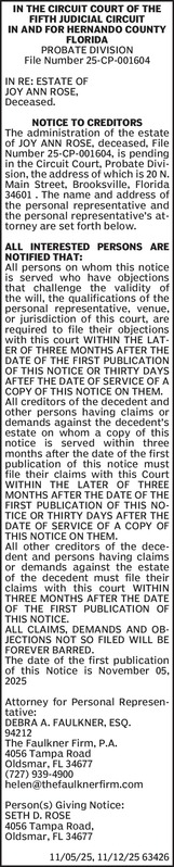 IN THE CIRCUIT COURT FOR CITRUS COUNTY, FLORIDAPROBATE DIVISIONFile No.: 2025-CP-252 IN RE: ESTATE OFPAMELA LOU ZOLCZER, a/k/a PAMELA ZOLCZERDeceased. NOTICE TO CREDITORS ... Show more »