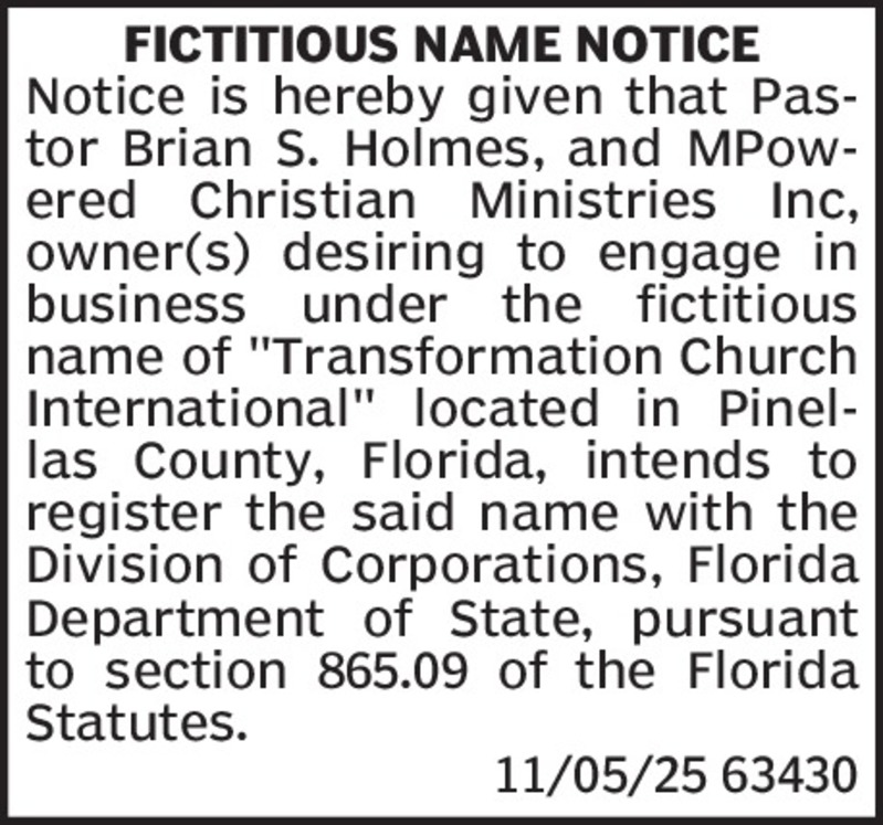 Fictitious Name NoticeNotice is hereby given that Safer Home Services North America, LLC, desiring to engage in business under the fictitious name of Clear Pest Pros of Clearwater located at 4190 1...