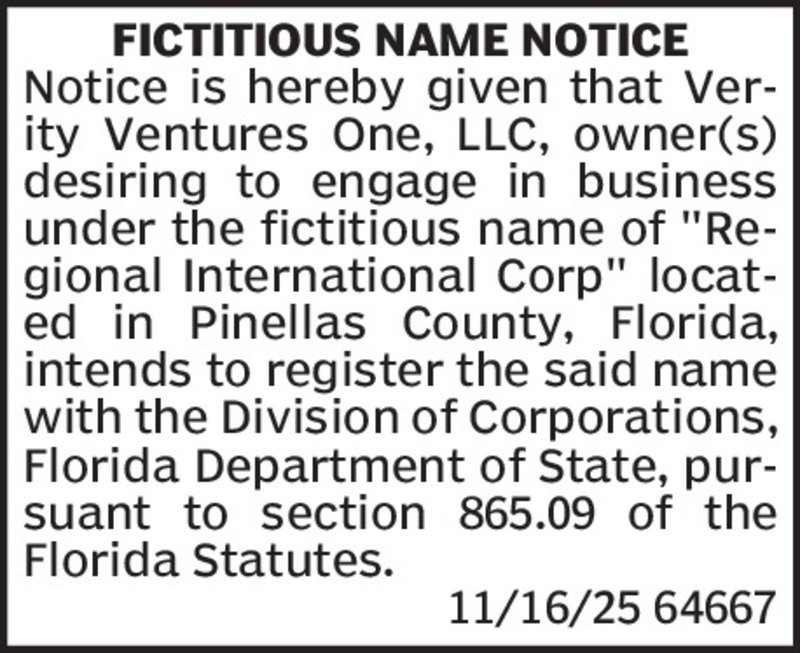 FICTITIOUS NAME NOTICENotice is hereby given that Fuel Medical, PLLC, owner, desiring to engage in business under the fictitious name of “FuelMed” located in Hillsborough County, Florida, intends t...