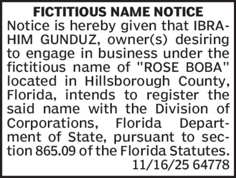 NOTICE UNDER FICTITIOUS NAME LAW PURSUANT TO SECTION 865.09, FLORIDA STATUTES NOTICE IS HEREBY GIVEN that the undersigned, desiring to engage in business under the Fictitious Name of Merrell, with ...
