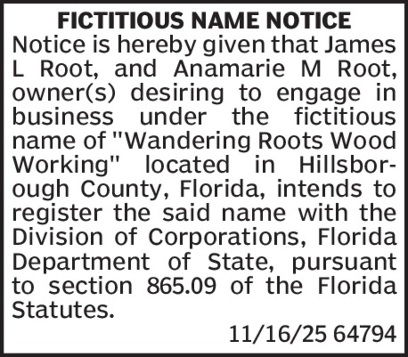 FICTITIOUS NAME NOTICENotice is hereby given that Fuel Medical, PLLC, owner, desiring to engage in business under the fictitious name of “FuelMed” located in Hillsborough County, Florida, intends t...