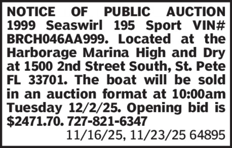 NOTICE OF PUBLIC SALENotice is hereby given that PODS Enterprises, LLC, located at 4050 Louis Ave, Holiday, FL 34691, will sell the contents of certain containers at auction to the highest bidder t...