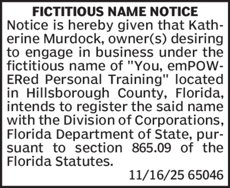 FICTITIOUS NAME NOTICENotice is hereby given that Tampa Crane & Body Acquisition, LLC, owner, desiring to engage in business under the fictitious name of “Sunbelt Waste Equipment, LLC” located in H...