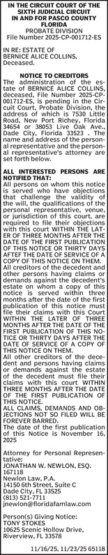 IN THE SIXTH JUDICIAL CIRCUIT COURT IN AND FOR PASCO COUNTY, FLORIDA PROBATE DIVISION File No.:2025-CP-001464 IN RE: ESTATE OF BARBARA JEAN PAYNE Deceased NOTICE TO CREDITORS The administration of ... Show more »