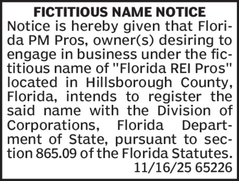FICTITIOUS NAME NOTICENotice is hereby given that Trifin Labs, LLC, owner, desiring to engage in business under the fictitious name “ Ciiimple” located in Pinellas County, Florida, intends to regis...
