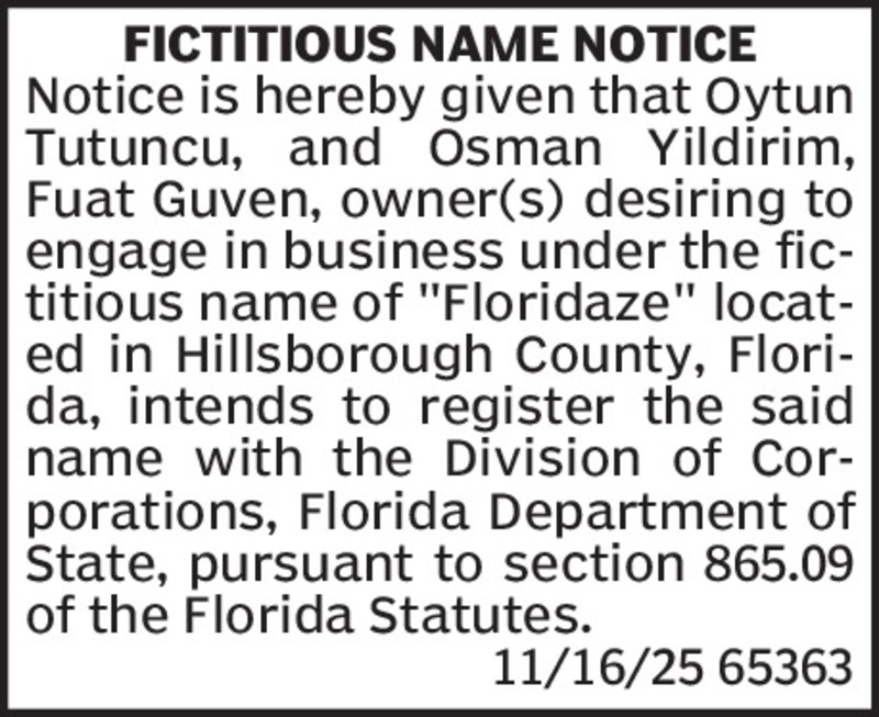 FICTITIOUS NAME NOTICENotice is hereby given that Trifin Labs, LLC, owner, desiring to engage in business under the fictitious name “ Ciiimple” located in Pinellas County, Florida, intends to regis...