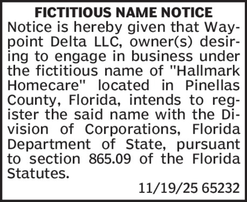 Fictitious Name NoticeNotice is hereby given that Tina Appoloney, desiring to engage in business under the fictitious name of Tales from the Unlonely Traveler located at 809 Kirkcaldy Way Valrico F... Show more »
