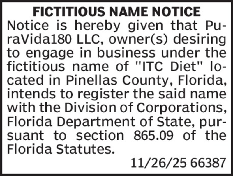 Fictitious Name NoticeNotice is hereby given that ZT Automotive of Tampa Four, LLC, a Florida limited liability company, desiring to engage in business under the fictitious name of Maus Acura of No... Show more »