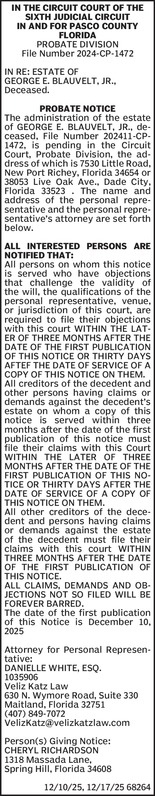 IN THE CIRCUIT COURT FOR CITRUS COUNTY, FLORIDAPROBATE DIVISIONFile No.: 2025-CP-1078 IN RE: ESTATE OF WILLIAM G. BRAEM, Deceased. NOTICE TO CREDITORS The administration of the estate of WIL... Show more »