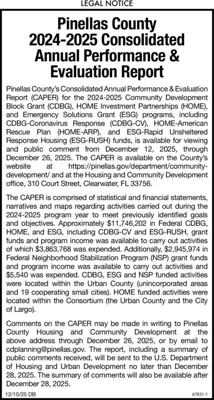 NOTICE OF PUBLIC SALENotice is hereby given that on 12/19/25 at 10:30 a.m., the following property will be sold at public auction pursuant to F.S. 715.109: 1970 HOME mobile home bearing the vehicle... Show more »