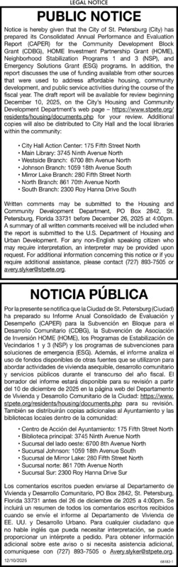 NOTICE OF PUBLIC SALENotice is hereby given that on 12/19/25 at 10:30 a.m., the following property will be sold at public auction pursuant to F.S. 715.109: 1970 HOME mobile home bearing the vehicle... Show more »