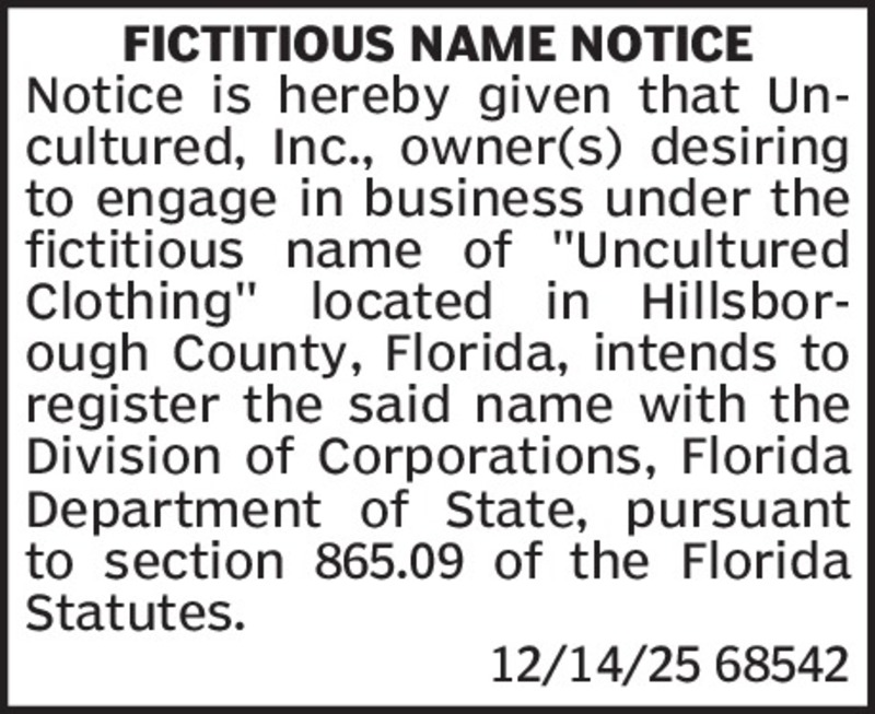NOTICE UNDER FICTITIOUS NAME LAW PURSUANT TO SECTION 865.09, FLORIDA STATUTES NOTICE IS HEREBY GIVEN that the undersigned, desiring to engage in business under the Fictitious Name of Florida Pipett... Show more »