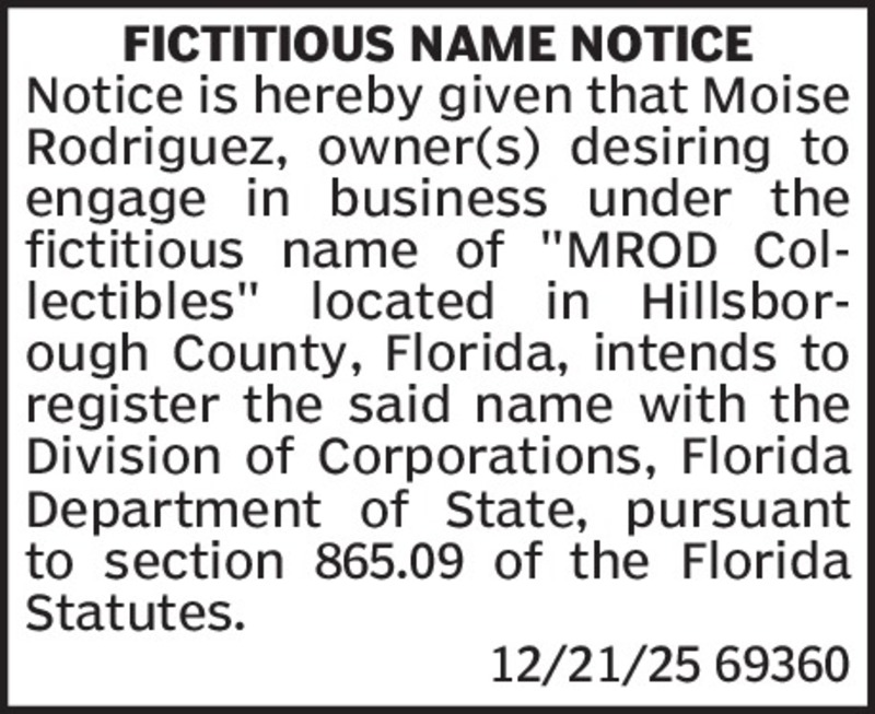 NOTICE UNDER FICTITIOUS NAME LAW PURSUANT TO SECTION 865.09, FLORIDA STATUTES NOTICE IS HEREBY GIVEN that the undersigned, desiring to engage in business under the Fictitious Name of Animal Hospita... Show more »