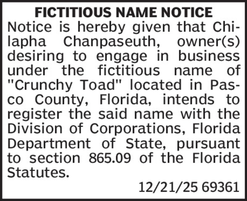 Fictitious Name NoticeNotice is hereby given that Brenden Watkins, desiring to engage in business under the fictitious name of Apex Testosterone and Weight Loss Institute located at 16703 Early Ris... Show more »