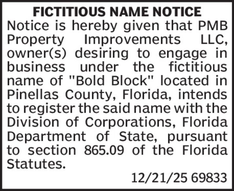 Fictitious Name NoticeNotice is hereby given that Proactive Systems LLC, desiring to engage in business under the fictitious name of Proactive Security located at 18865 SR 54 #201, Lutz, FL 33558 i...