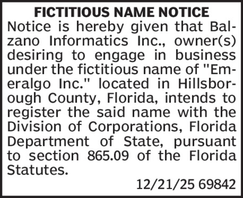 Fictitious Name NoticeNotice is hereby given that Jigar Patel and Anand Patel, desiring to engage in business under the fictitious name of Sunshine Pharmacy located at 38449 County Road 54, Zephyrh...