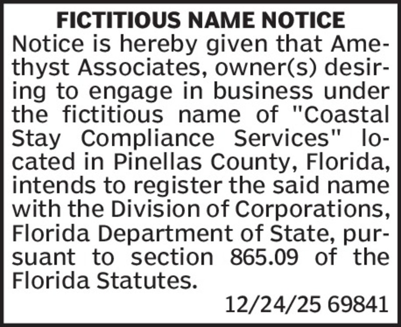 FICTITIOUS NAME NOTICENotice is hereby given that Compass Consulting & Solutions LLC, owner(s), desiring to engage in business under the fictitious name of The Industry Speaks Academy located at 43...