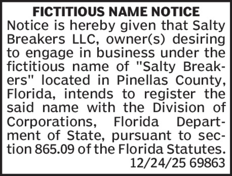 FICTITIOUS NAME NOTICENotice is hereby given that Gause Built Marine Group LLC, desiring to engage in business under the fictitious name of Gause Built Boats located at 728 Wesley Ave, Ste 10, Tarp...