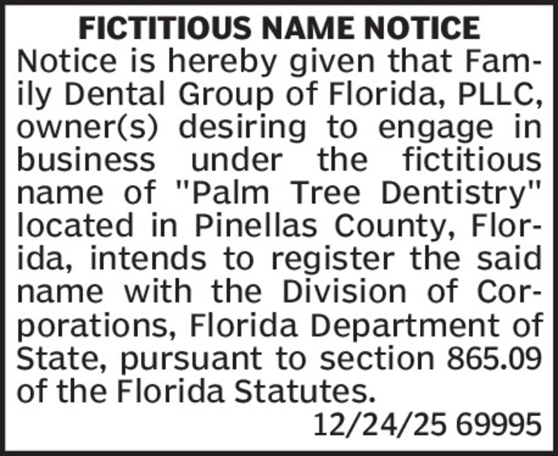 FICTITIOUS NAME NOTICENotice is hereby given that Gause Built Marine Group LLC, desiring to engage in business under the fictitious name of Gause Built Custom Boats located at 728 Wesley Ave, Ste 1...