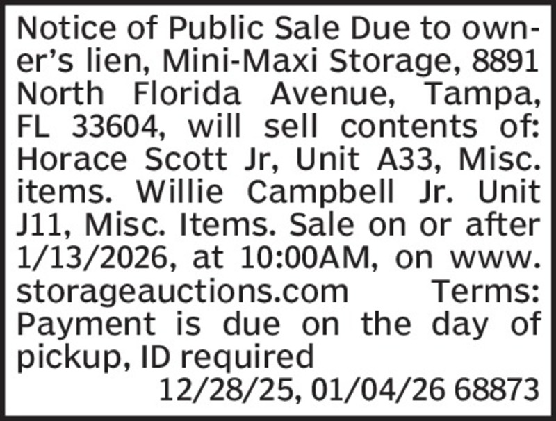 U-Haul Co of GainesvilleNotice is hereby given that on January 8th, 2026 U-Haul hereby publishes notice, as required by Florida “Self-Storage Act”, section 83.806 and 83.807, of a public sale of th... Show more »