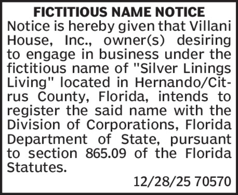 FICTITIOUS NAME NOTICENotice is hereby given that FR Roadway, LLC, Owner, desiring to engage in business under the fictitious name of “Flash-Rite” located in Hillsborough County, Florida, intends t...