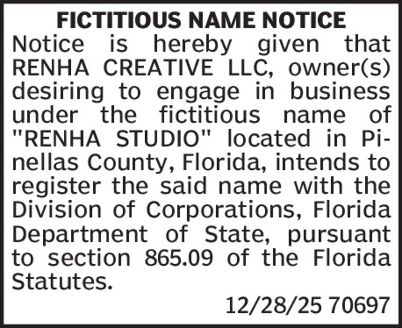 Fictitious Name NoticeNotice is hereby given that Apeksha Kotian, desiring to engage in business under the fictitious name of Rooted Bites located at 1531 Leaf Flower Ln, Lutz, 33558 intends to reg...
