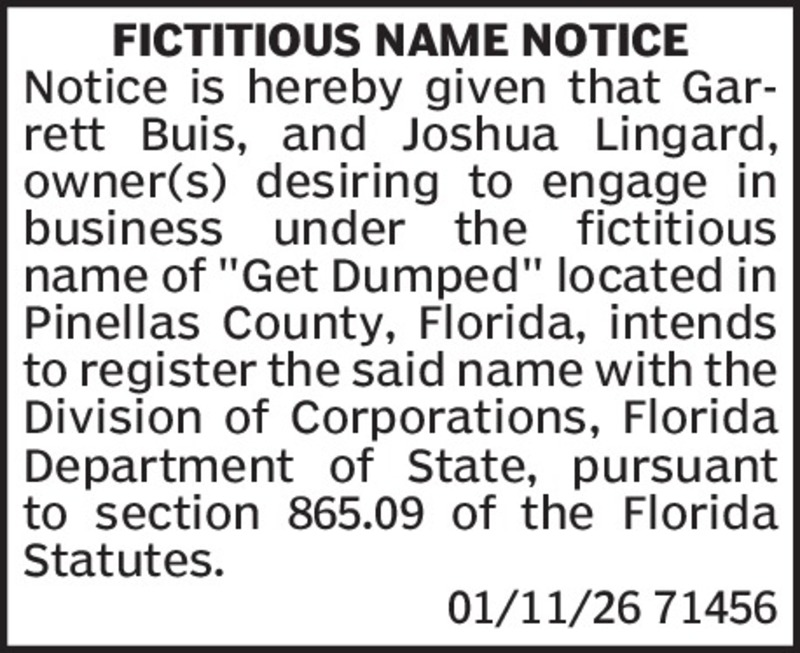 NOTICE UNDER FICTITIOUS NAME LAW PURSUANT TO SECTION 865.09, FLORIDA STATUTES NOTICE IS HEREBY GIVEN that the undersigned, desiring to engage in business under the Fictitious Name of Gateway Manage...