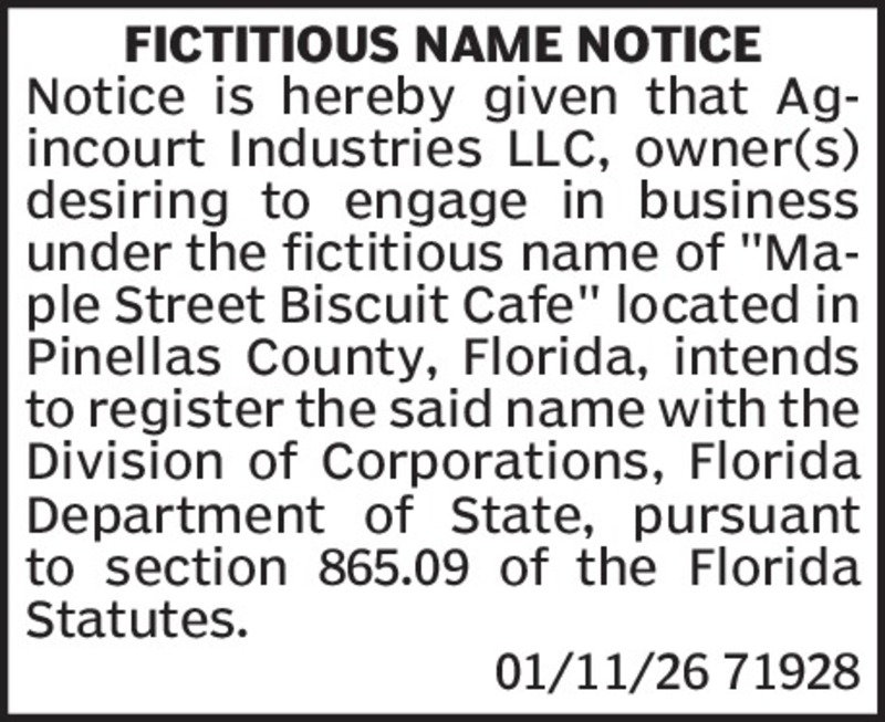 FICTITIOUS NAME NOTICENotice is hereby given that Murphy Enterprises of Pinellas, L.L.C., Owner, desiring to engage in business under the fictitious name of “G and S, LLC” located in Pinellas Count... Show more »