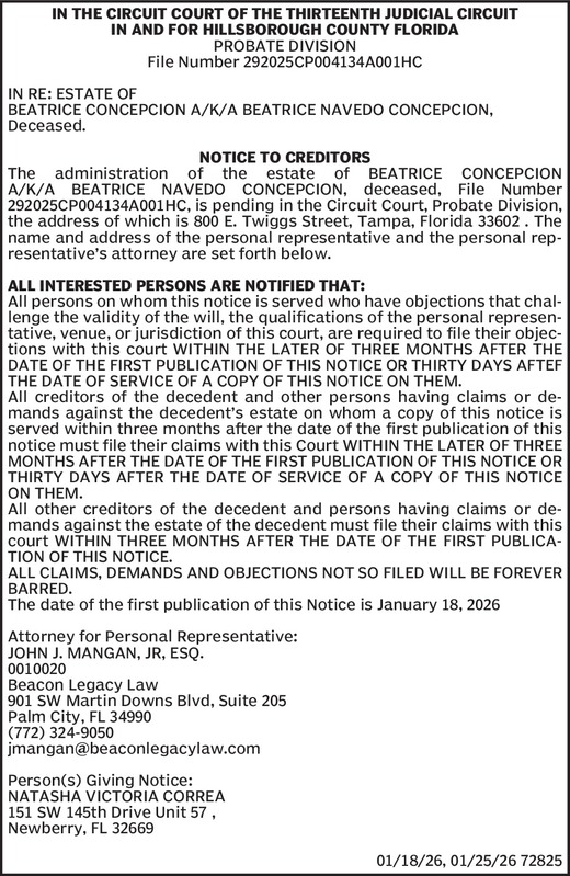 IN THE CIRCUIT COURT FOR PASCO COUNTY, FLORIDAPROBATE DIVISIONFile No. 25-CP-002024IN RE: ESTATE OFMARIE REGINA DAY,Deceased. NOTICE TO CREDITORSThe administration of the estate of Marie Regina D... Show more »