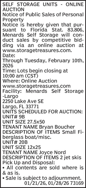 NOTICE OF PUBLIC SALEThe following personal property of Eugene McKenna and/or Eugene R. Mc Kenna will, on Friday, February 6, 2026, at 10:00 am, at 3113 State Road 580, Lot 325, Amber Glades Estate... Show more »