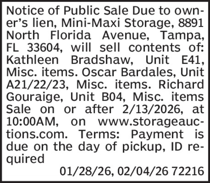 NOTICE OF PUBLIC SALENotice is hereby given that on 02/09/2026 at 10:30 a.m., the following property will be sold at public auction pursuant to F.S. 715.109: A 1973 SKYL mobile home bearing Vehicle... Show more »