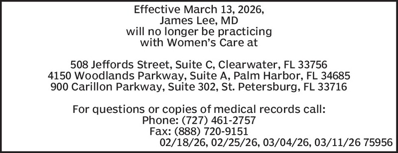 LEGAL NOTICEDr. John Cottam is closing his practice February 1st 2026. For records text (813) 318-2539 or email Skinmd@Hotmail.com2/4, 2/11, 2/18, 2/25/26 69702b Show more »