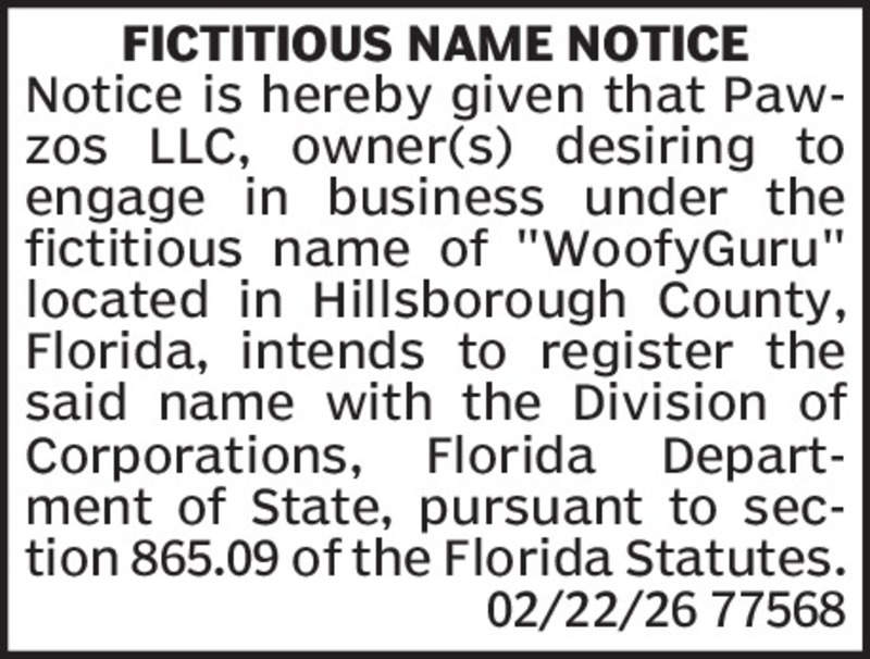 FICTITIOUS NAME NOTICENotice is hereby given that Famous Tate Electric Co., a Florida corporation, desiring to engage in business under the fictitious name of “Famous Tate” in multiple counties in...