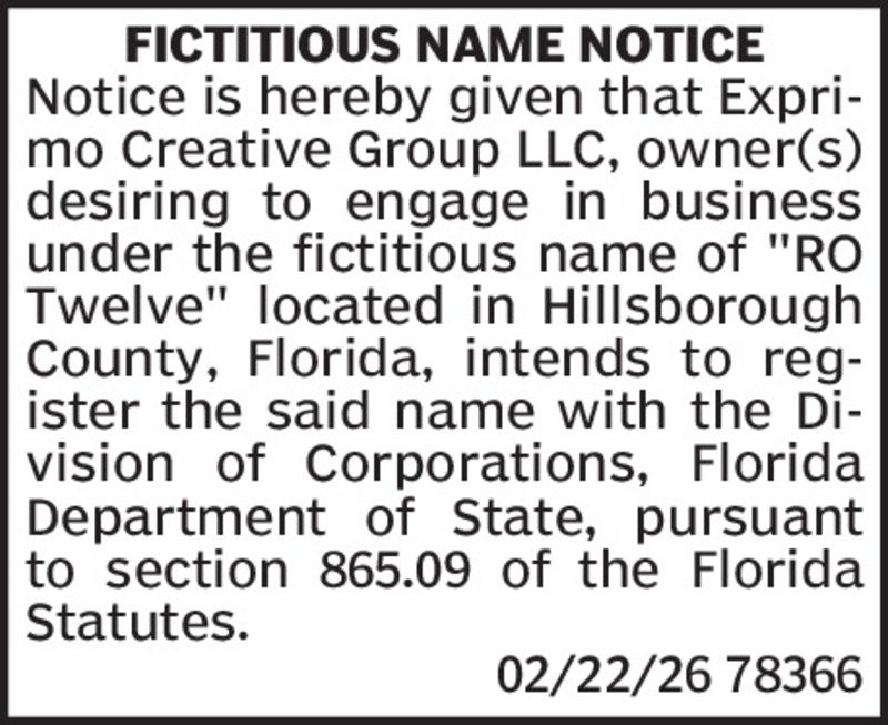 NOTICE UNDER FICTITIOUS NAME LAW PURSUANT TO SECTION 865.09, FLORIDA STATUTES NOTICE IS HEREBY GIVEN that the undersigned, desiring to engage in business under the Fictitious Name of SUCCESSION CAP...